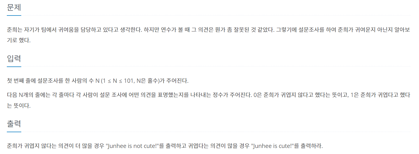 먼저 설문조사를 할 사람의 수 N을 입력받는다. 준희가 귀엽다는 수(c)와 귀엽지 않다는 수(nc)를 0으로 설정한다. for i in range(N): 을 통해 N만큼 반복하고, 0을 입력받으면 nc, 1을 입력받으면 c의 값을 1씩 증가한다. N만큼 반복 후 c>nc면 "Junhee is cute!"를, nc>c면 "Junhee is not cute!"를 출력한다.