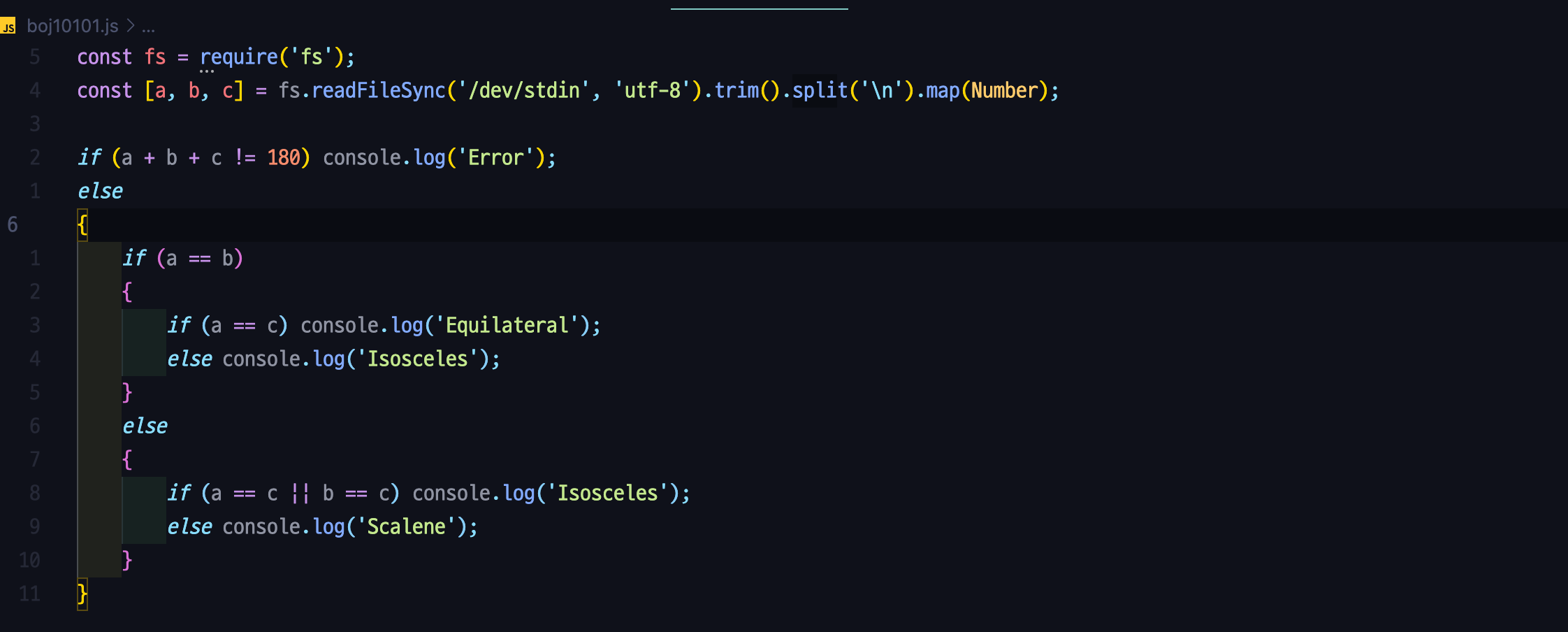 문제의 설명에 따라 Equilateral, Isosceles, Scalene, Error 중 하나를 출력한다.
