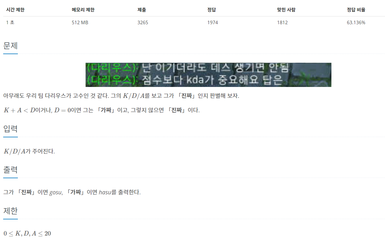 K/D/A를 문자열로 받고 이를 "/"를 기준으로 문자열을 쪼개어 다시 정수형으로 변환시키고 K+A를 연산하고 D=0의 여부를 확인한다. python의 경우 split함수를 쓰면 되지만 c++에는 그런 함수가 없기 때문에 stringstream 함수를 이용해 getline 함수에 맞는 인스턴스로 문자열 str을 변환시키고 getline함수로 "/"를 기준으로 잘라낸 문자를 숫자로 변환해 미리 만든 배열 li에 하나씩 집어넣는다.