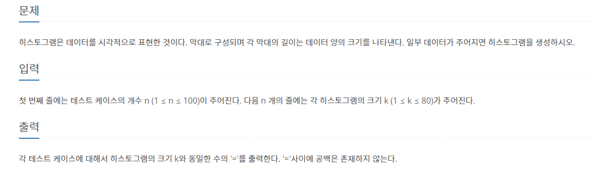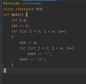테스트 케이스를 몇 번할 것인지에 대해서 숫자를 입력받고, 입력 받은 숫자만큼 숫자를 차례대로 입력해주면, 입력해준 숫자만큼 '='이 나와야 하므로, for문을 써야겠다는 생각이 들었다.
