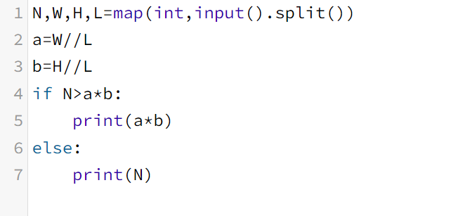 헛간의 가로 길이W 세로길이 H 이면 소는 가로로 W//L만큼 갈수 있고 세로로 H//L만큼 들어갈수 있다 따라서 헛간에 들어갈수 있는 최대 소의 수는 (W//L)*(H//L)이고 이 수가 N보다 크면 N마리가 들어갈수 있는 최대 마리수 이다