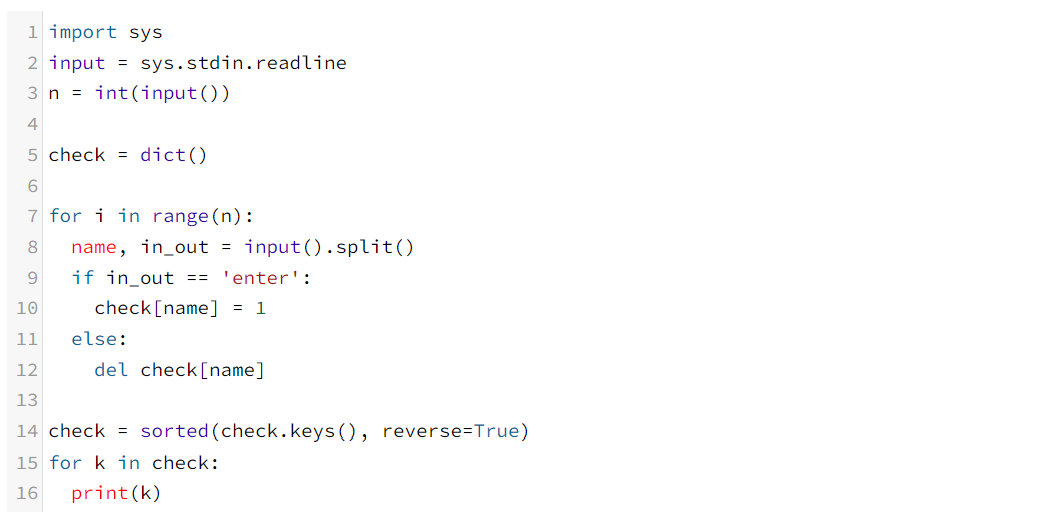 딕셔너리에 입력 받은 이름과 그에 따른 출퇴근 여부를 저장하도록 해준다. 그리고 퇴근이 찍히면 그 사람의 이름을 지워준다. 마지막에 남은 사람의 이름을 알맞게 출력해준다.