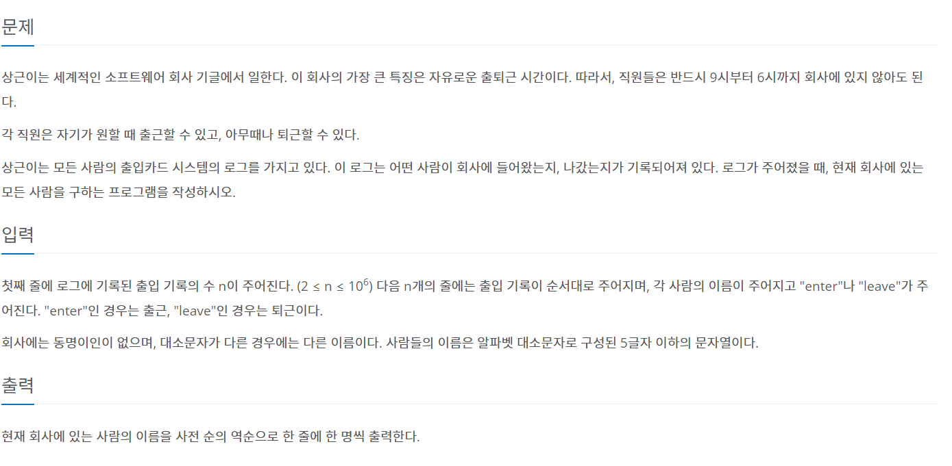 첫째 줄에 로그에 기록된 출입 기록의 수 n이 주어진다. (2 ≤ n ≤ 106) 다음 n개의 줄에는 출입 기록이 순서대로 주어지며, 각 사람의 이름이 주어지고 "enter"나 "leave"가 주어진다. "enter"인 경우는