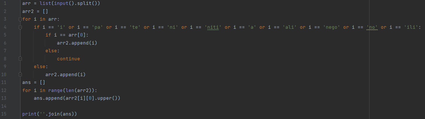 입력되는 문장을 공백마다 나누어 리스트에 저장한다. 그 후 리스트에 저장된 단어들중에 'i', 'pa', 'te', 'ni', 'niti', 'a', 'ali', 'nego', 'no', 'ili'이 문장의 첫 마디에 있으면 이니셜을 arr2에 저장하고 그 외의 단어들도 이니셜을 arr2에 저장한다. 그 후 upper함수를 통해 arr2에 저장된 단어들을 대문자로 바꾼후 출력한다.