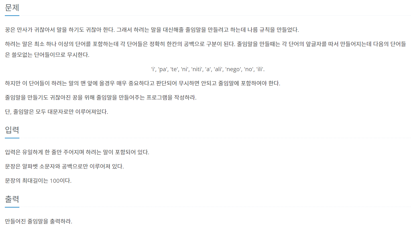 입력되는 문장에서 단어의 앞글자를 대문자로 하여 줄임말을 만든다. 단, 'i', 'pa', 'te', 'ni', 'niti', 'a', 'ali', 'nego', 'no', 'ili' 는 무시하나 맨처음으로 올 경우 줄임말에 포함한다.