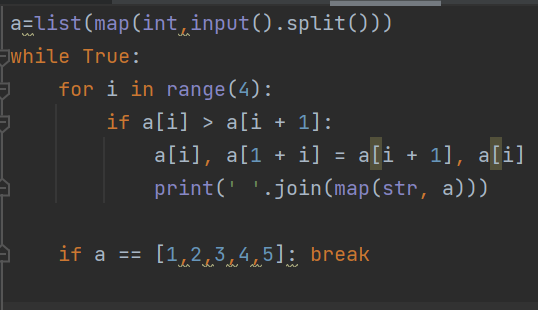 숫자 5개를 리스트로 입력 받고 for문으로 돌의 위치를 바꾼다 if문 안에 print를 만들어 위치를 바꿀때만 숫자를 출력하게 하고 숫자가 오름차순으로 모두 정리가 될때까지 while으로 반복한다
