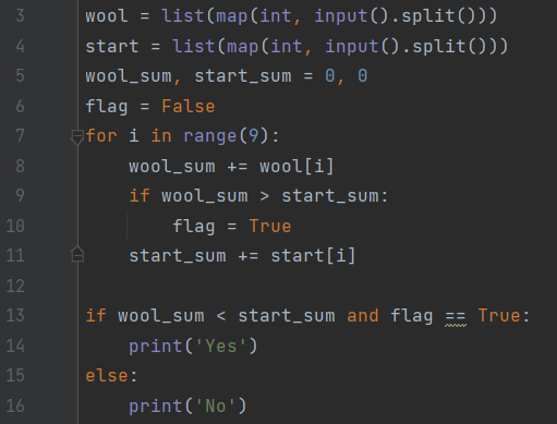 첫번째 줄에 울림 제미니스의 1회 초 ~ 9회 초에 낸 득점이 주어지고, 두번째 줄엔 스타트링크 걸리버스의 1회 초 ~ 9회 초에 낸 득점이 주어진다. 그 후 울림 제미니스가 역전패 당했으면 Yes를 출력하고 아니면 No를 출력한다.