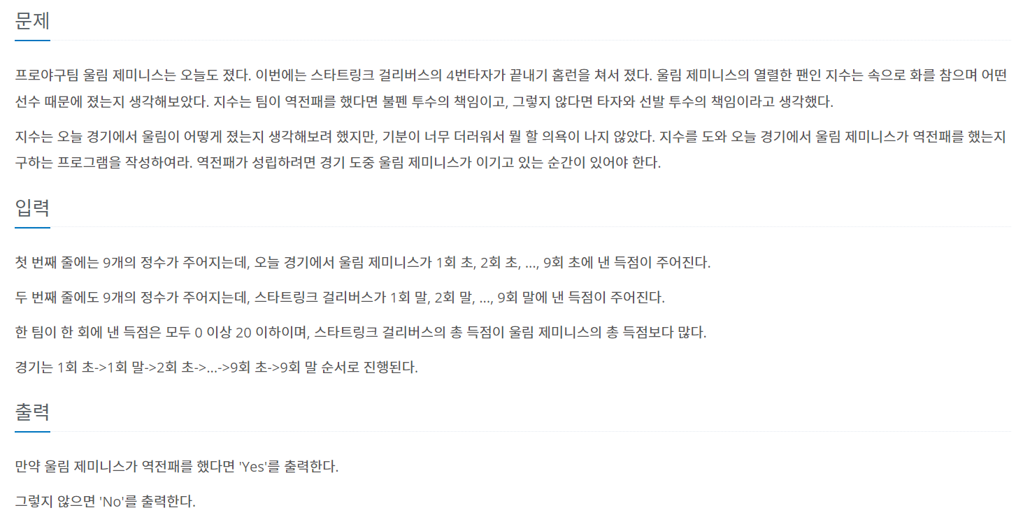 각 팀의 점수를 받아 각각의 리스트에 저장한다. 그 후 for문을 통해 각 팀의 점수를 합한다. 그 때 울림 제미니스가 점수를 리드하고 있으면 flag를 True로 바꾼다. 앞에 설명한 if문을 스타트링크 걸리버스의 점수를 더하기 전에 하여 초공격과 말공격을 구분한다. 9회까지의 점수를 모두 합한 후 울림 제미니스가 졌고 flag가 True이면 역전패 당한 것이므로 Yes를 출력하고 아니면 No를 출력한다.