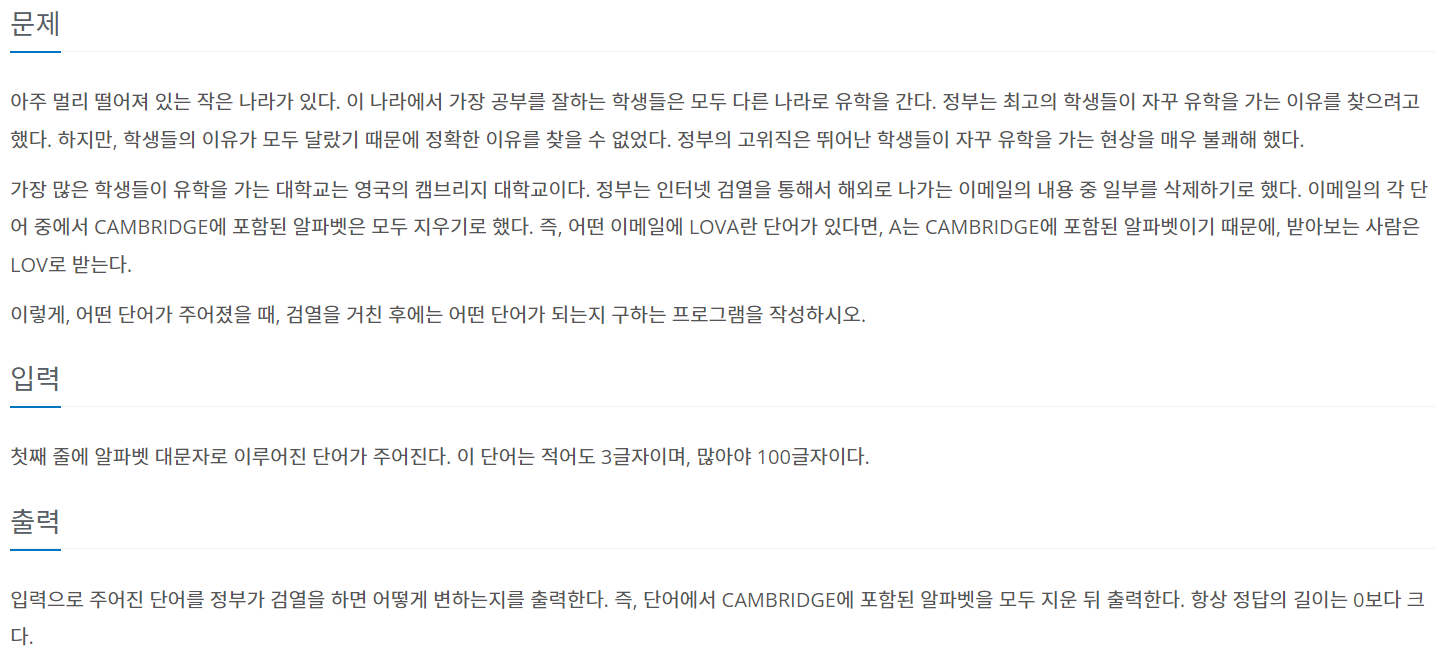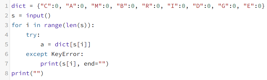 알파벳 대문자로 이루어진 단어를 입력받으면 "CAMBRIDGE"에 포함된 알파벳을 모두 지운 뒤 출력한다.