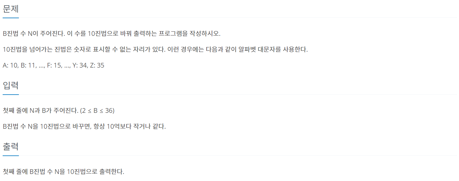 진법 수 B와 바꿔 줄 수 N을 입력 받은 후에 10진법의 수로 변환하여 출력하는 문제이다.