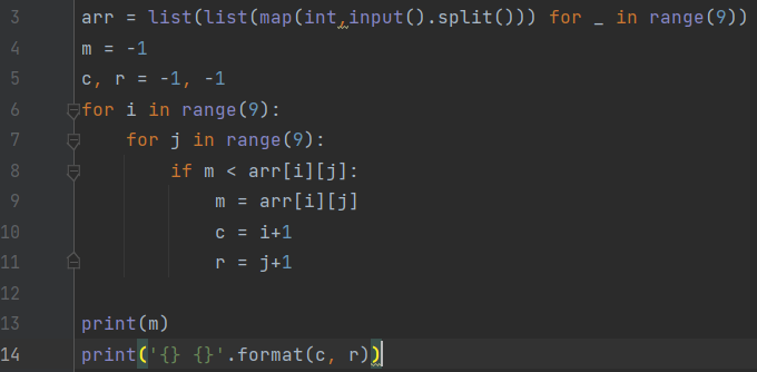 첫째 줄에 최댓값을 출력하고, 둘째 줄에 최댓값이 위치한 행 번호와 열 번호를 빈칸을 사이에 두고 차례로 출력한다. 최댓값이 두 개 이상인 경우 그 중 한 곳의 위치를 출력한다.
