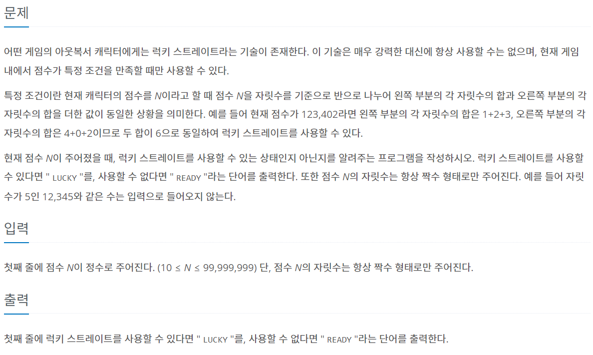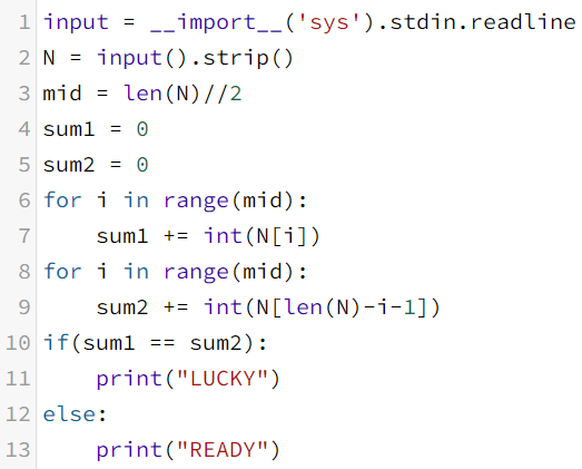 짝수 자릿수의 수가 주어지면 윗 자릿수 반의 수끼리 더한 값과 아래 자릿수 반의 수끼리 더한 값을 비교하여 같으면 LUCKY를 출력, 같지않으면 READY를 출력한다.