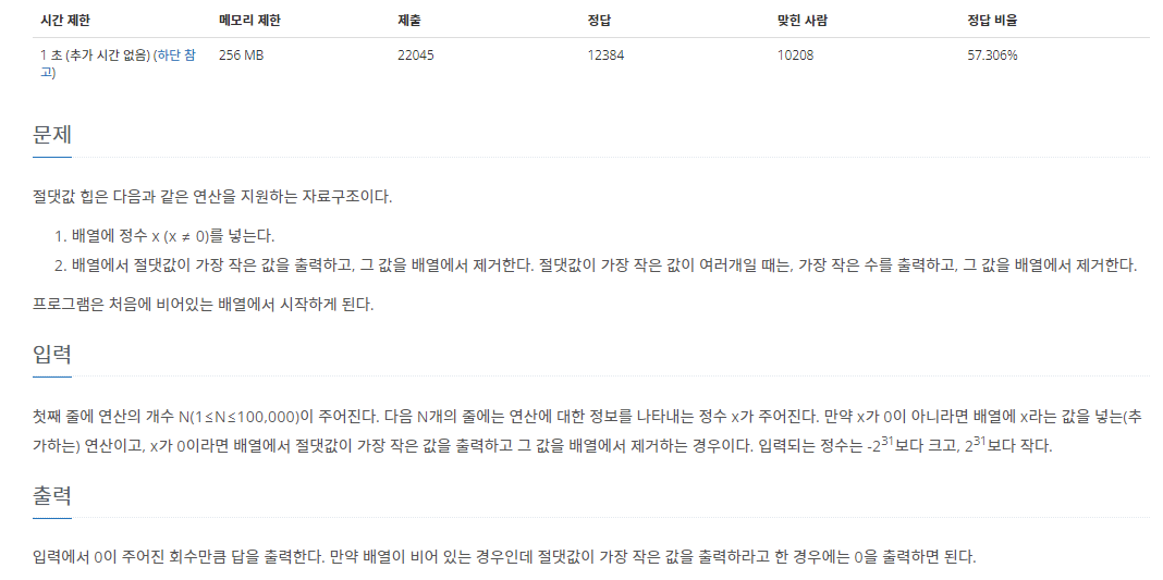 먼저 문제 제목과 같이 이는 힙을 사용하여 절대값을 넣은 뒤 이를 출력해주는 문제이다.
