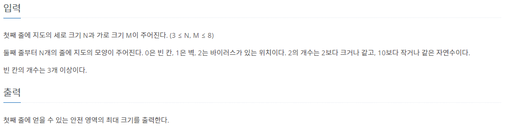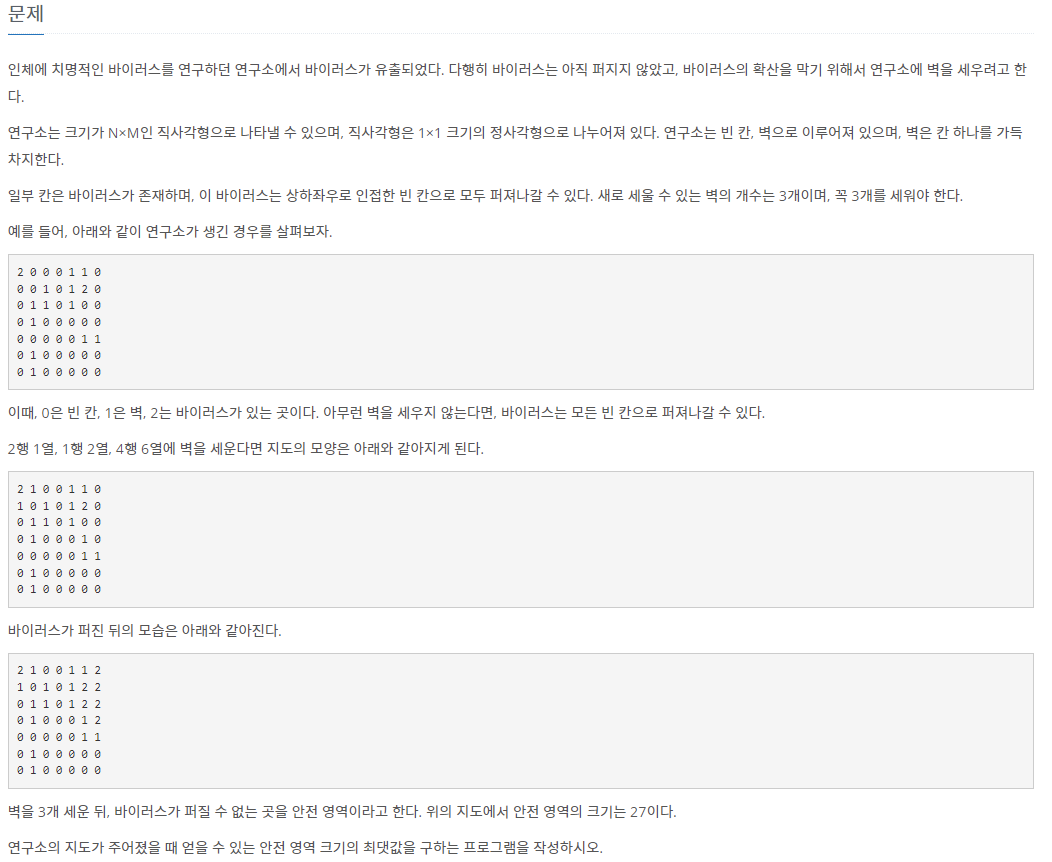 이 문제는 바이러스인 2가 상하좌우로 퍼지는데 이를 벽 3개를 생성하여 가장 많은 안전 영역의 크기를 구하는 문제이다.