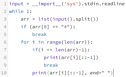 문자열이 입력되면 각 단어별로 reverse해서 출력하는 것이다. #을 입력하면 종료한다.