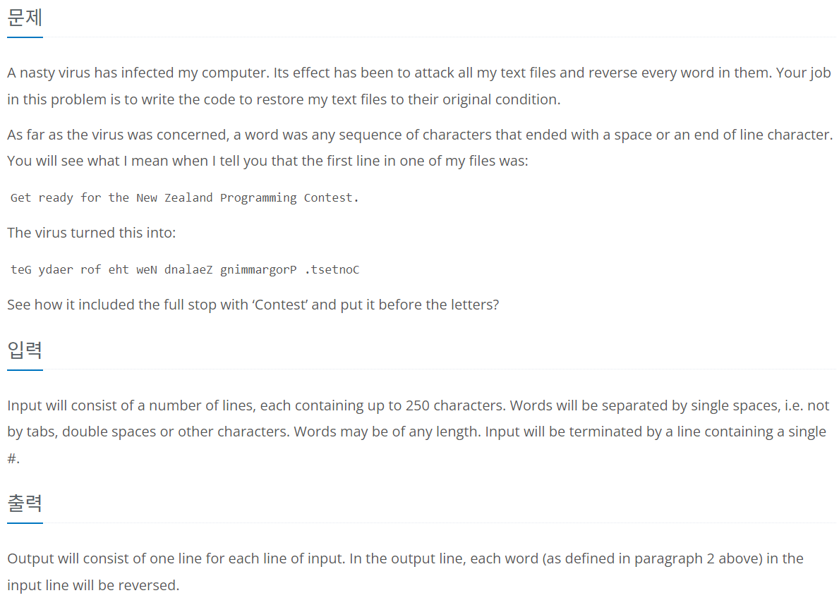 문자열이 입력되면 각 단어별로 reverse해서 출력하는 것이다. #을 입력하면 종료한다.