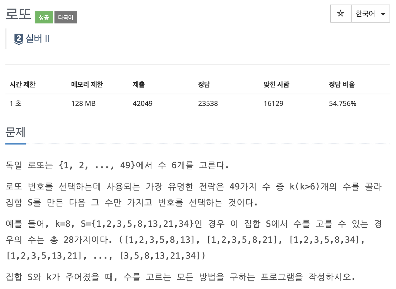nC6 조합을 구하여 모두 출력하는 문제. 파이썬 내장 itertools 라이브러리의 combinations 메소드를 사용하여 조합을 만들고 모두 출력하여 간단하게 풀이할 수 있다.