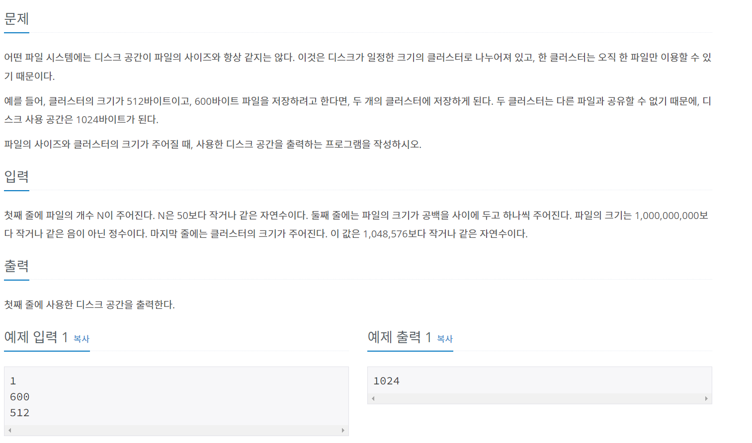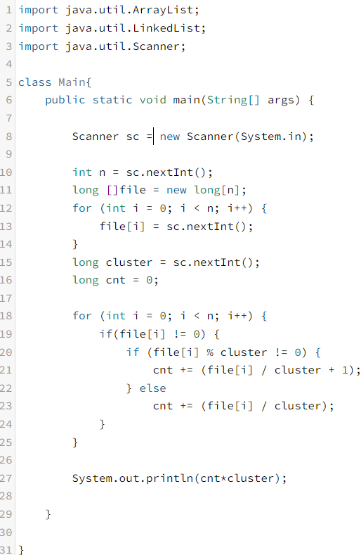 첫째 줄에 파일의 개수 N이 주어진다. N은 50보다 작거나 같은 자연수이다. 둘째 줄에는 파일의 크기가 공백을 사이에 두고 하나씩 주어진다. 파일의 크기는 1,000,000,000보다 작거나 같은 음이 아닌