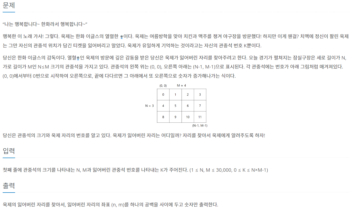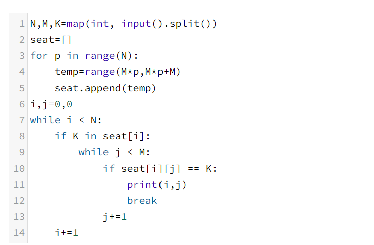 첫째 줄에 관중석의 크기를 나타내는 N, M과 잃어버린 관중석 번호를 나타내는 K가 주어진다. (1 ≤ N, M ≤ 30,000, 0 ≤ K ≤ N×M-1)