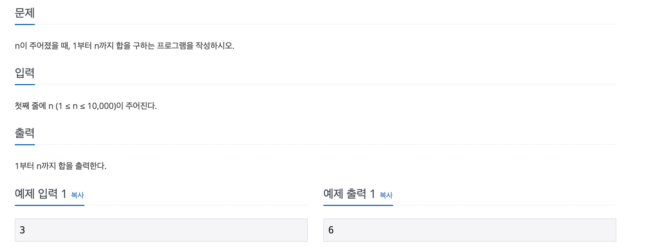 이 문제는 n을 입력받아 1,2,...n까지의 합을 출력하는 문제이다.