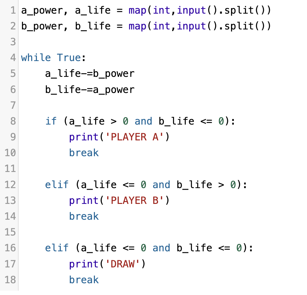 A와 B는 각각 공격력과 생명력을 가지고 있다. 서로를 공격한 후에 생명력이 얼마나 남아있는지 비교하여 풀 수 있는 문제이다.