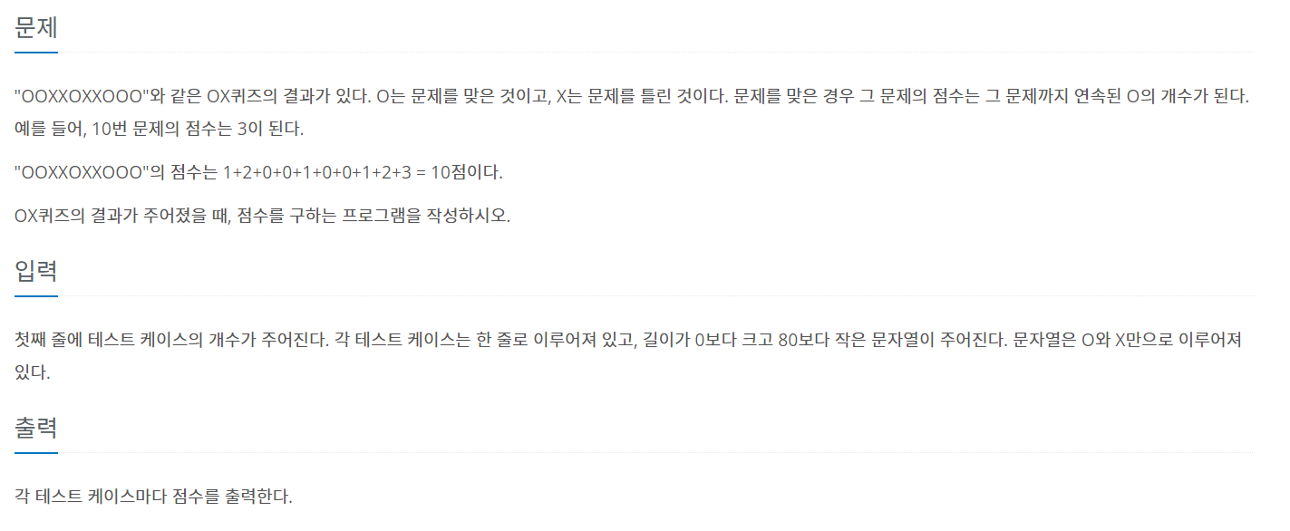 "OOXXOXXOOO"와 같은 OX퀴즈의 결과가 있다. O는 문제를 맞은 것이고, X는 문제를 틀린 것이다. 문제를 맞은 경우 그 문제의 점수는 그 문제까지 연속된 O의 개수가 된다. 예를 들어, 10번 문제의 점수