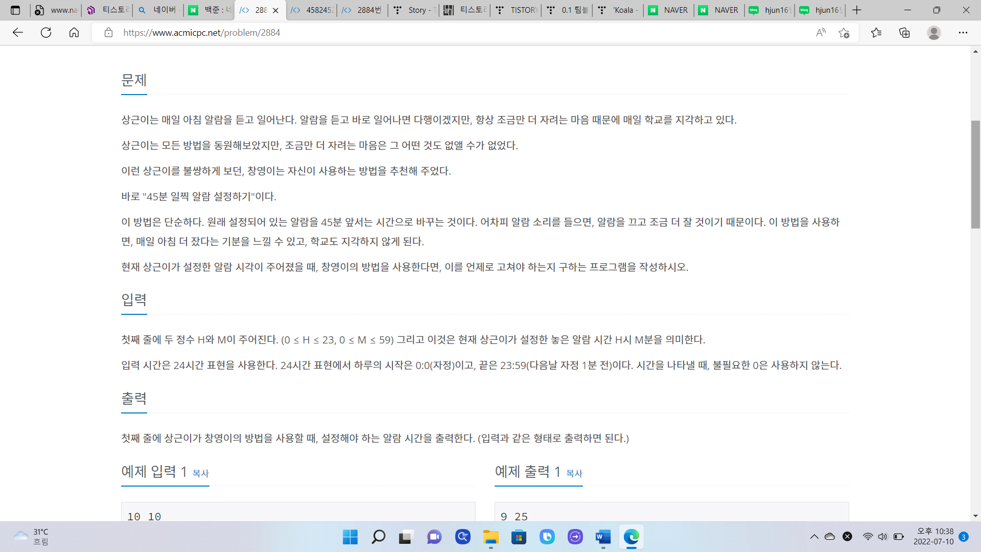 그리고 만약 m(분)이 45보다 크면 시간과 분만 출력되게 하고