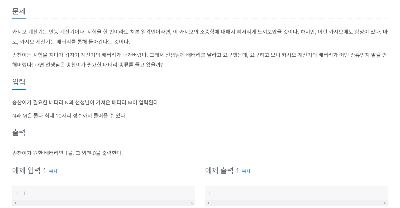 만약 송찬이가 필요한 베터리 N과 선생님이 가져온 베터리 M이 같으면 1을 출력하고, 다르면 0을 출력합니다.