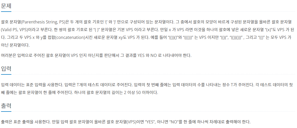 괄호 문자열(Parenthesis String, PS)은 두 개의 괄호 기호인 ‘(’ 와 ‘)’ 만으로 구성되어 있는 문자열이다. 그 중에서 괄호의 모양이 바르게 구성된 문자열을 올바른 괄호 문자열(Valid PS, VPS)이라고