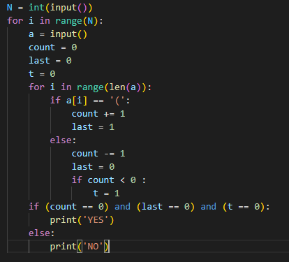 - 만약 ')'가 먼저 나오는 경우 count가 음수로 가기 때문에 음수로 가는 경우가 있는지 변수 t를 통해서 저장