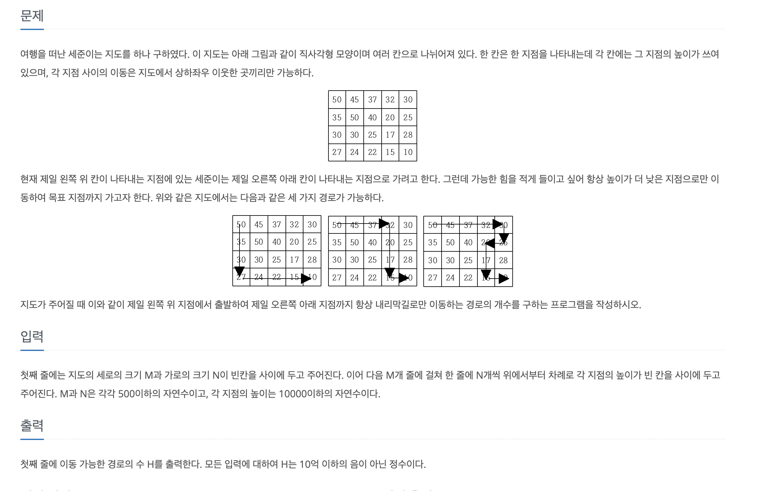 현재 자신이 있는 위치보다 낮은 위치로 갈 수 있고 0,0 에서 n-1,m-1까지 갈 수 있는 경로의 개수를 구하는 문제이다.