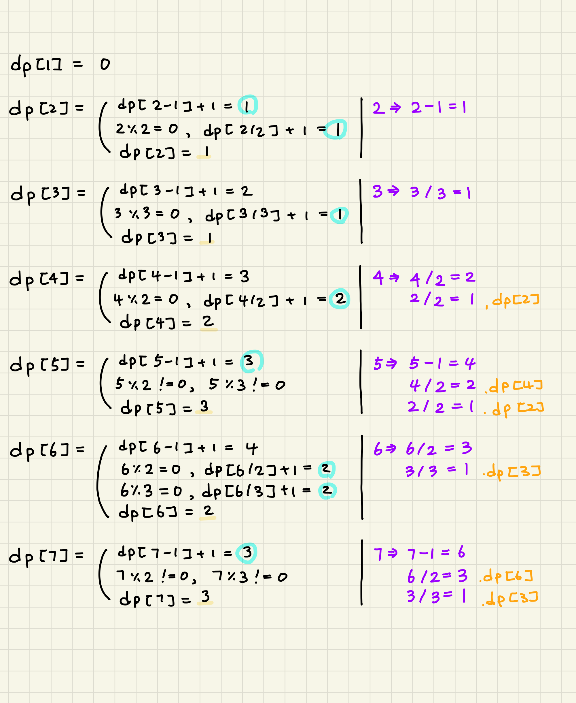 if (x % 3 == 0) tmp = min(tmp, dp[x / 3] + 1);