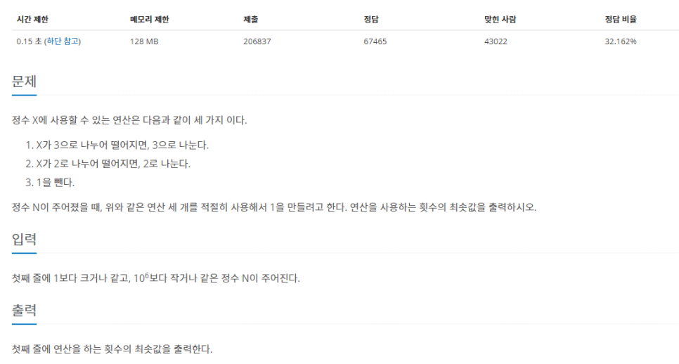 N을 입력하여 그 수가 위의 조건에 따라 1로 만드는 최소한의 횟수를 찾는 문제이다.