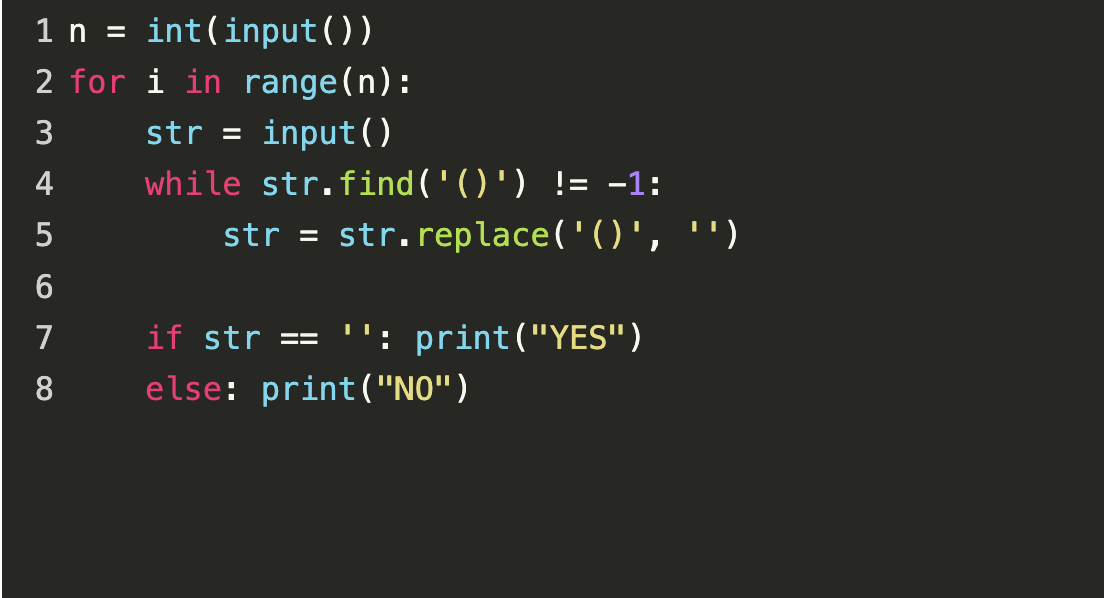맨처음에는 각 짝을 찾는 탐색형식으로 문제를 풀려고 했는데, 그렇게 하면 너무 번거롭게 됨을 깨닫고 방법을 찾다가 간편한 방식을 찾았다. 바로 '()'를 찾아 이를 문자열에서 제거하는 것이다. 그렇게 계속해서 제거하다보면 결국 짝이 맞는 문자열만이 공백이 되고, 안맞는 문자열은 한쪽 괄호만이 남게 된다.