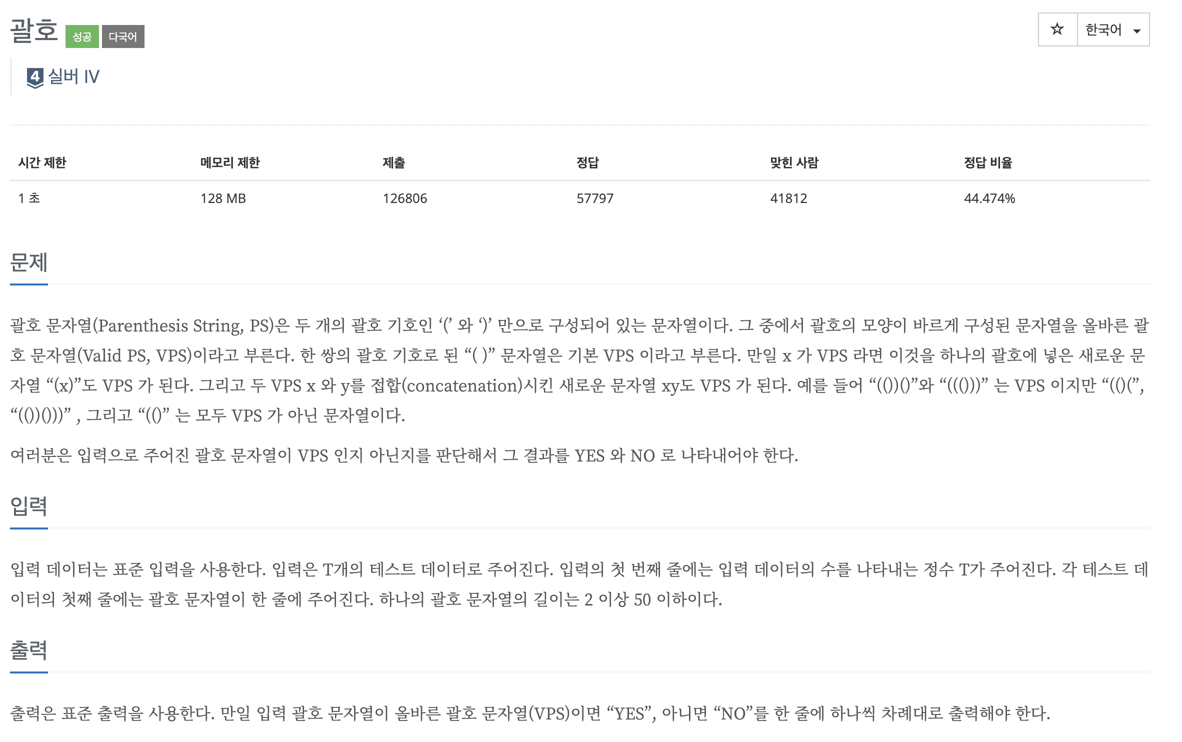 괄호 문자열(Parenthesis String, PS)은 두 개의 괄호 기호인 ‘(’ 와 ‘)’ 만으로 구성되어 있는 문자열이다. 그 중에서 괄호의 모양이 바르게 구성된 문자열을 올바른 괄호 문자열(Valid PS, VPS)이라고