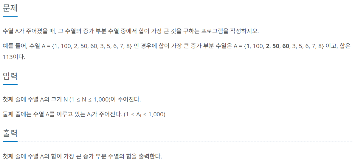 수열 A가 주어졌을 때, 그 수열의 증가 부분 수열 중에서 합이 가장 큰 것을 구하는 프로그램을 작성하시오. 예를 들어, 수열 A = {1, 100, 2, 50, 60, 3, 5, 6, 7, 8} 인 경우에 합이 가장 큰 증가 부분 수