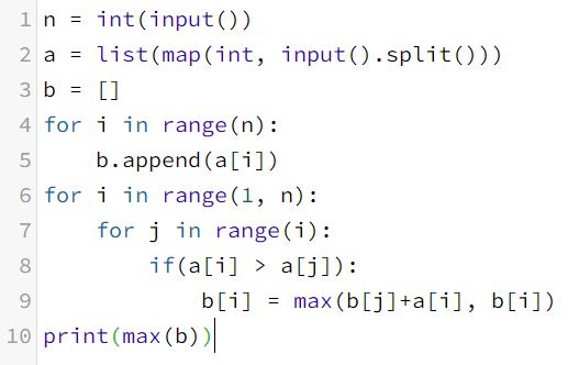 n이 최대 1000까지 이므로 O(n^2)을 하여도 1,000,000밖에 나오지 않기 떄문에 이중for문을 이용했다. 수열이므로 a[i]가 그 이전의 a 요소 보다 크다면 이전 부분수열의 누적합인 b[j]와 a[i]의 합과, 현재 누적합인 b[i] 중 큰 값을 b[i]에 저장해주었다.