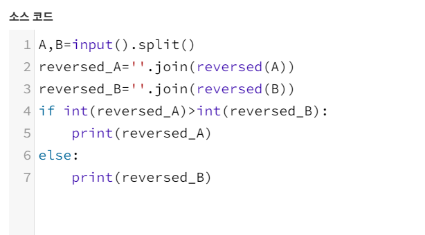 A와 B를 입력받고 reversed로 수를 거꾸로 돌린다음 돌린 수를 비교하여 출력한다.