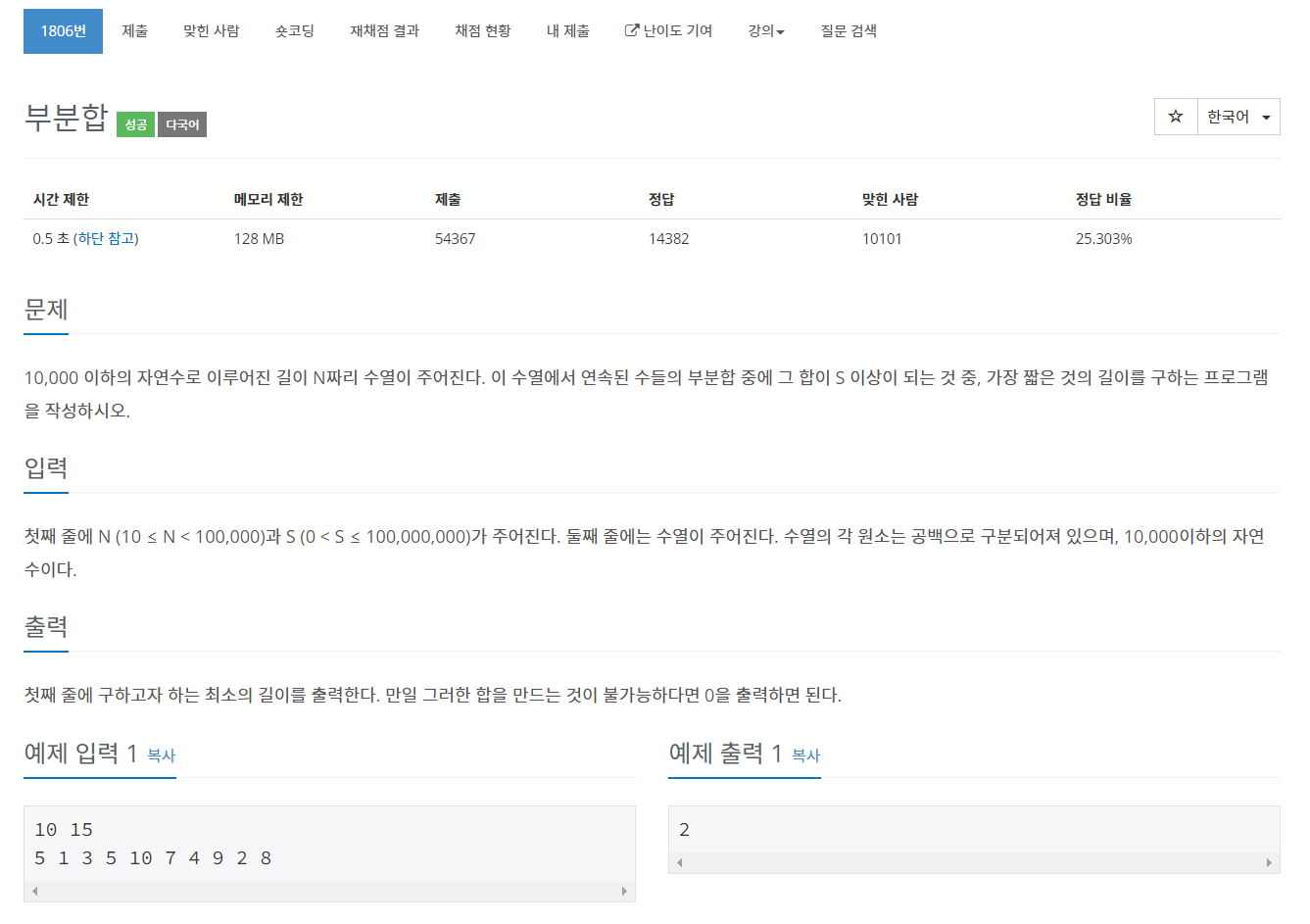 10000 이하의 자연수로 이루어진 수열에서 부분 연속합이 S이상 되는 것 중에서 가장 짧은 것의 길이를 구하는 문제다. 투 포인터를 사용하여 조건을 충족하는 것들 중 가장 짧은 것의 길이를 구하면 된다.