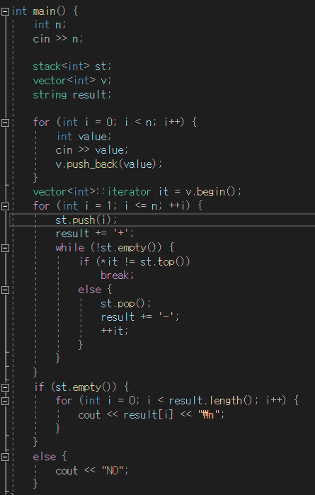 문제를 이해하는 데 많은 시간이 걸렸다. 숫자를 하나씩 입력받으면서 스택에 넣고 미리 오름차순으로 만들어놓은 벡터의 값과 같으면 꺼낸다. 마지막 숫자가 꺼내지면 벡터에 있는 값과 같아야한다. 만약 다르다면 만들 수 없는 수열이다.