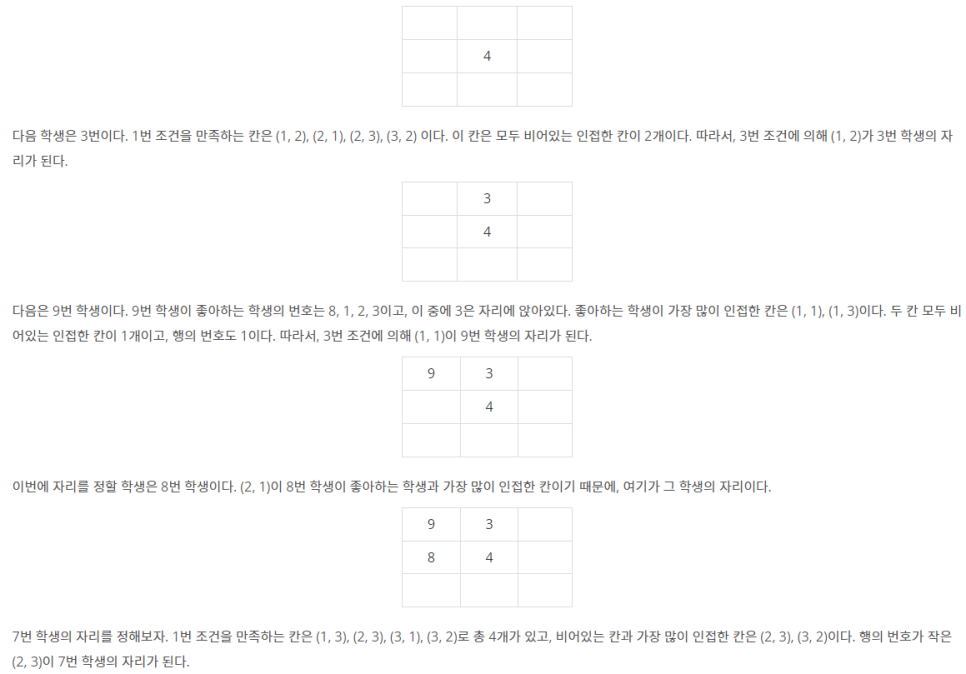 1. 비어있는 칸 중에서 좋아하는 학생이 인접한 칸에 가장 많은 칸으로 자리를 정한다.