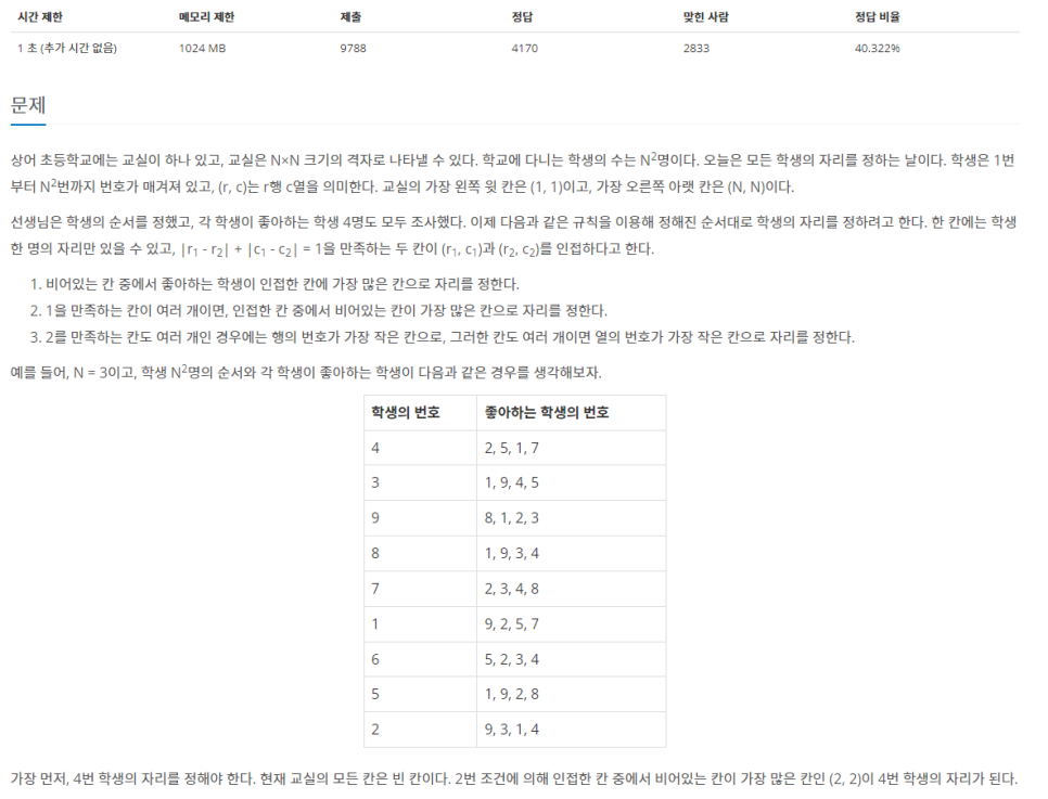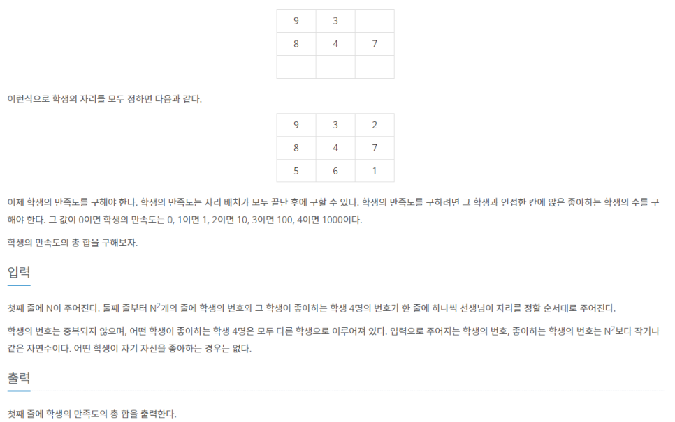 위 3가지 조건을 만족하는 자리배치를 하고, 좋아하는 학생 수에 따른 만족도 계산하여 출력하도록 한다.