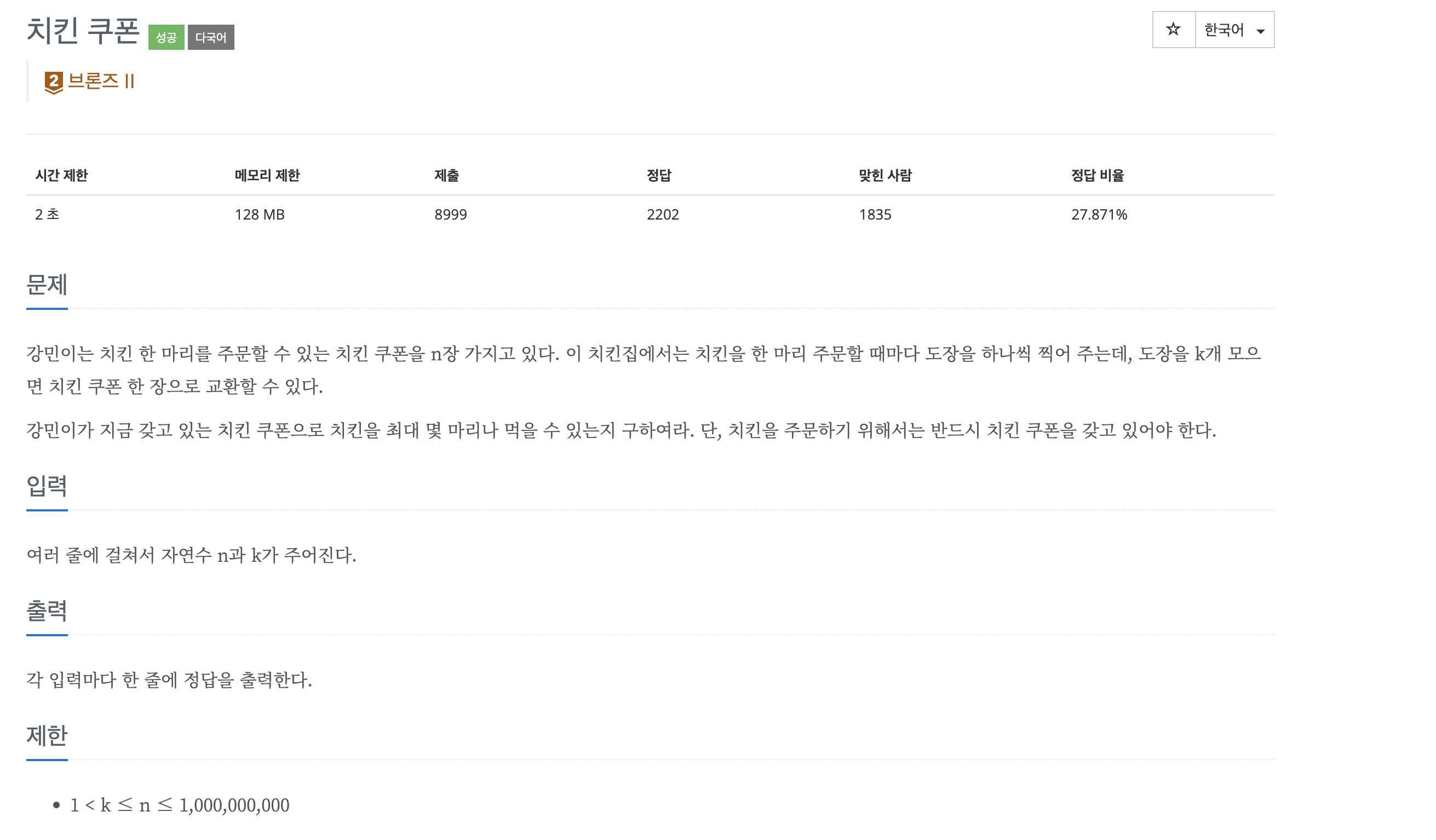 문제 해석이 조오끔 난해했다. 맨처음 n마리의 치킨을 시키면 그만큼의 도장이 또 생기고, 그를 k 번 나눈 몫만큼의 치킨을 또 시킬 수 있고, 그만큼의 도장이 또 생긴다. 이렇게 생긴 도장이 맨처음 시킨 치킨 n마리만큼의 도장//k 만큼을 합친 것 만큼 또 합쳐져 시킨을 시킬 수 있다.