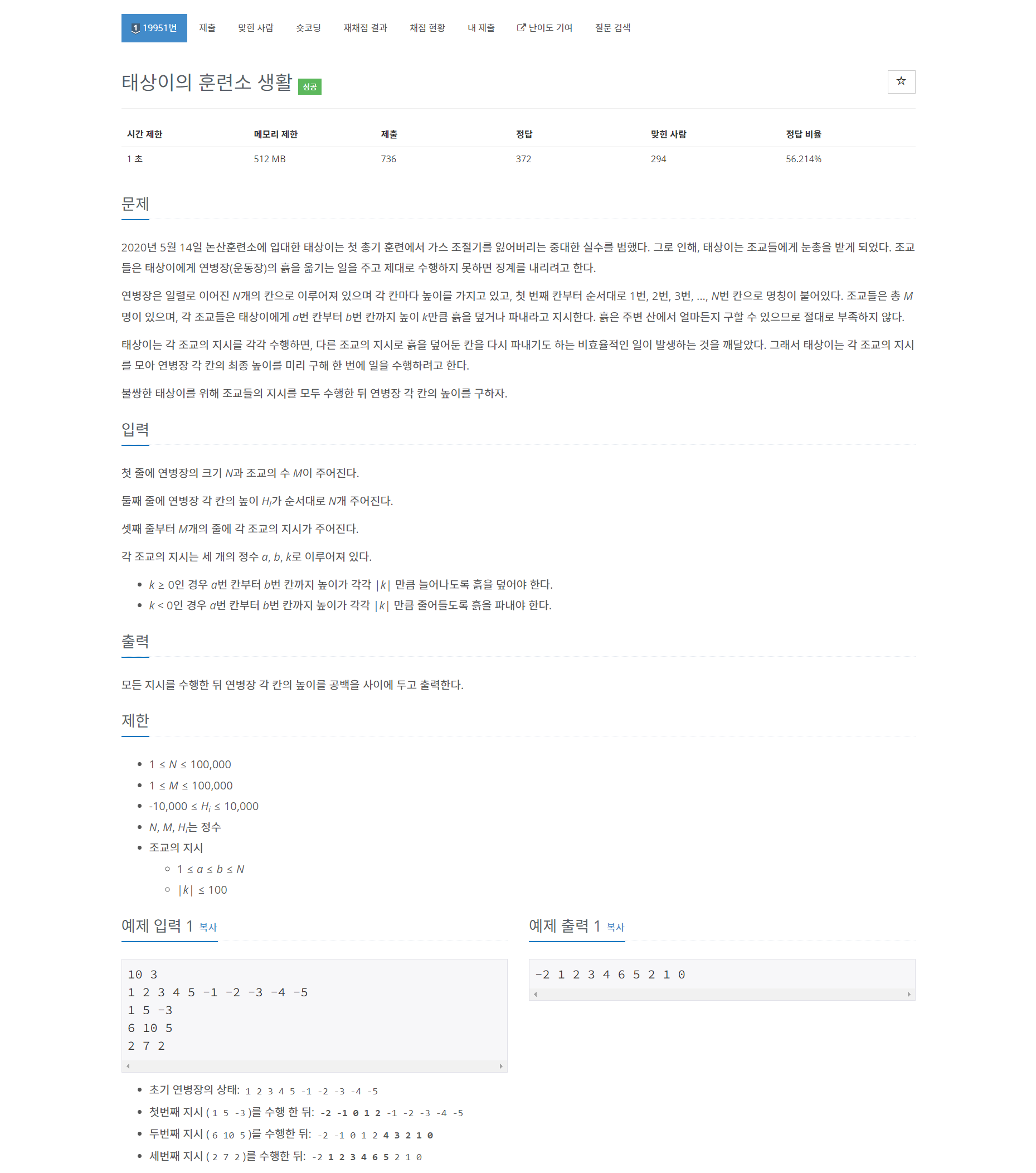 배열에서 일정 범위 a~b에 정수 k를 더하는 명령을 여러 번 수행하는 문제입니다. 단순히 매 명령마다 배열에서 a~b까지 k를 더하도록 구현하면 시간복잡도가 O(NM)이 되어 시간 안에 문제를 풀 수 없습니다.