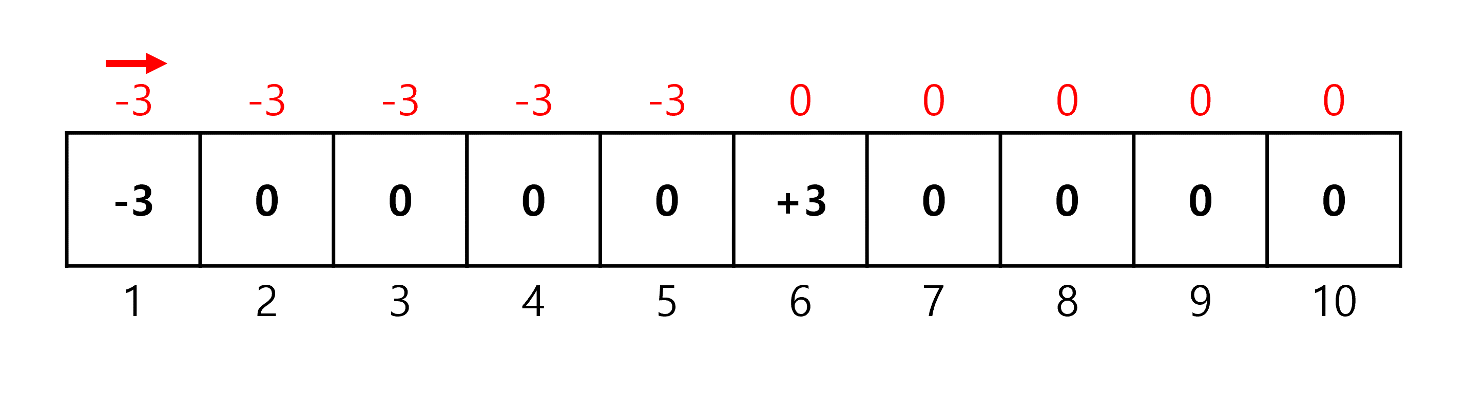 문제의 예제에서 a=1, b=5, k=-3의 명령을 기록한 배열의 모습입니다. a에 k, b+1에 -k를 기록하고 1부터 누적합을 구하면, 이 누적합이 a부터 b까지 k를 더하는 명령과 같다는 것을 알 수 있습니다.