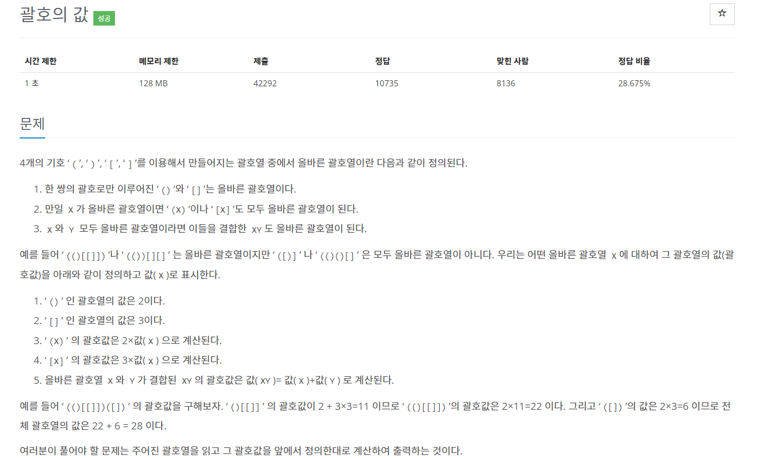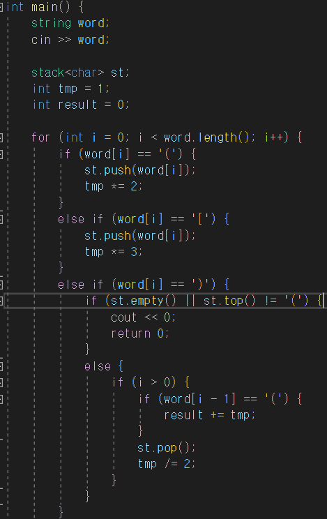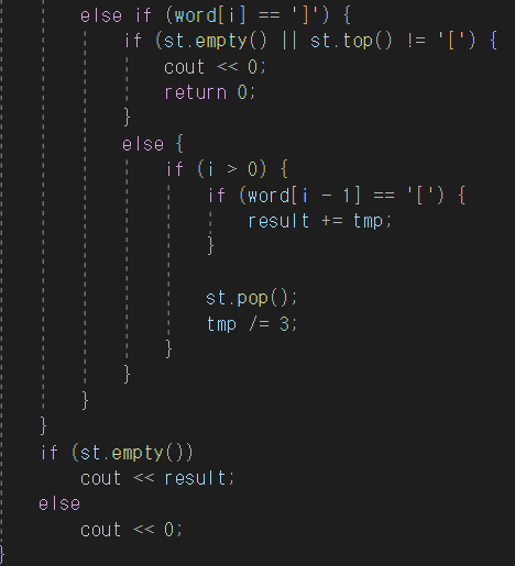 많은 시간을 투자했는데 결국 구글링의 힘을 빌려 알고리즘을 보고 구현만 직접 한 문제이다. 어떤 변수를 통해서 값을 곱하고 나눠야 하지않을까 까지는 접근하였는데, 너무 복잡하게 생각했는지 아니면 남은 한 문제만 빨리 해결하고 싶어서 그랬던 건지 직전 인덱스의 값만 보고 result에 더할 생각을 하지 못했다. 결국 내가 생각한 방법이 틀렸구나 모르겠다 하고 검색한 것인데 예상외로 너무 단순해서 억울했던 기억이 있다. 이전에 stack을 이용한 괄호 문제들처럼 stack을 이용하여 올바른 괄호묶음인지 판단하였다. ( 이면 2를 곱해주고 [이면 3을 곱해주며, ) 이면 2를 나눠주고 ] 이면 3을 나눠줬다. 그리고 닫는 괄호가 나왔을 때 top의 값이 맞지 않으면 무조건 올바르지 않기때문에 끝내버리고, 이전 index와 짝이 맞는 값이라면 짝이 맞는 괄호값이 최고로 커졌음을 의미하므로(그 뒤에 닫는 괄호가 나오면 top과 비교만 해주면 된다) result에 더해준다.