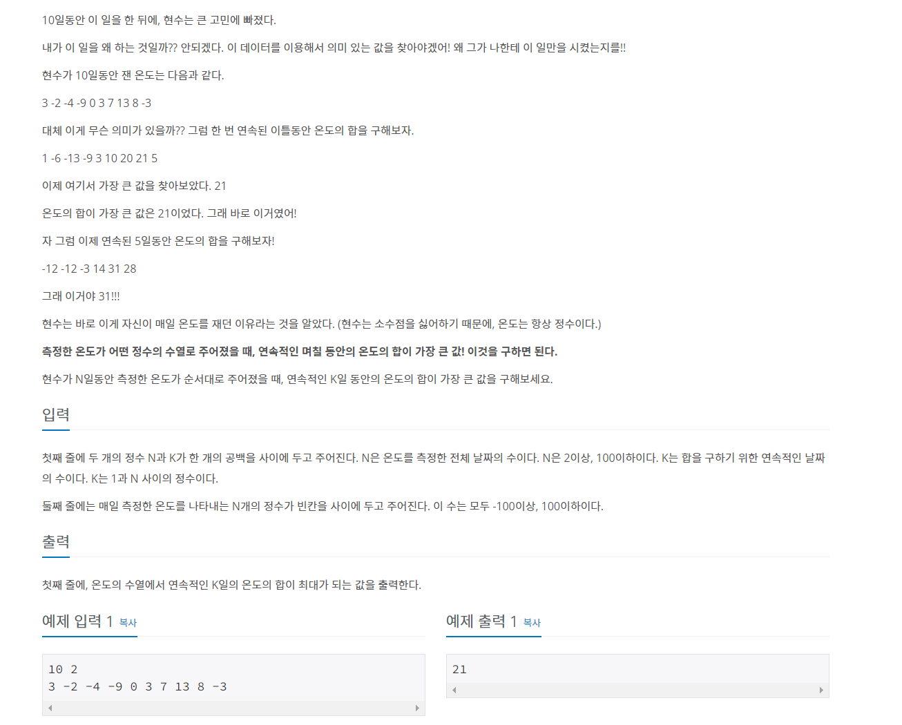 첫째 줄에 두 개의 정수 N과 K가 한 개의 공백을 사이에 두고 주어진다. N은 온도를 측정한 전체 날짜의 수이다. N은 2이상, 100이하이다. K는 합을 구하기 위한 연속적인 날짜의 수이다. K는 1과 N 사