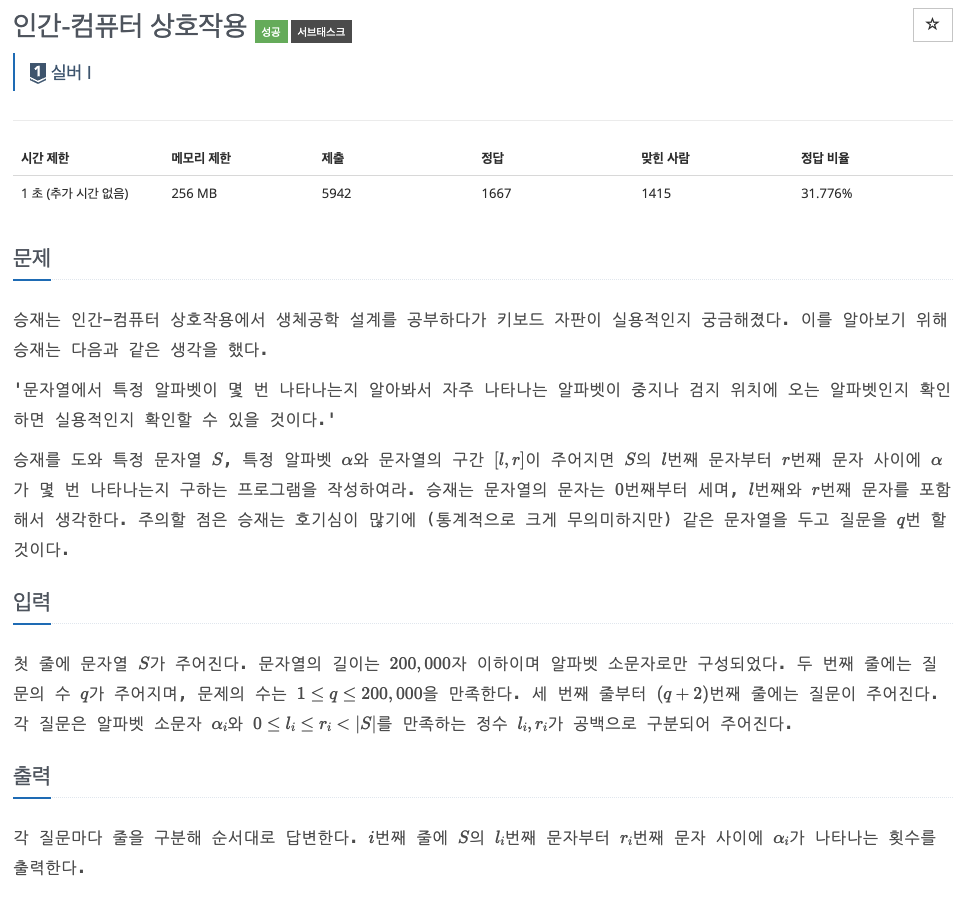 질문이 최대 200,000개 주어지며 알파벳이 중복으로 주어질 수 있기 때문에 누적 합을 이용해서 시간복잡도를 줄여야 한다.