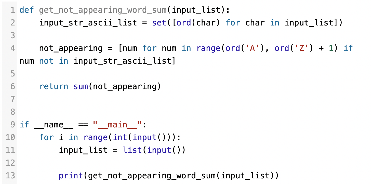 - 입력받은 문자열에서 문자를 가져와 ord 함수를 이용해 아스키 코드로 변환