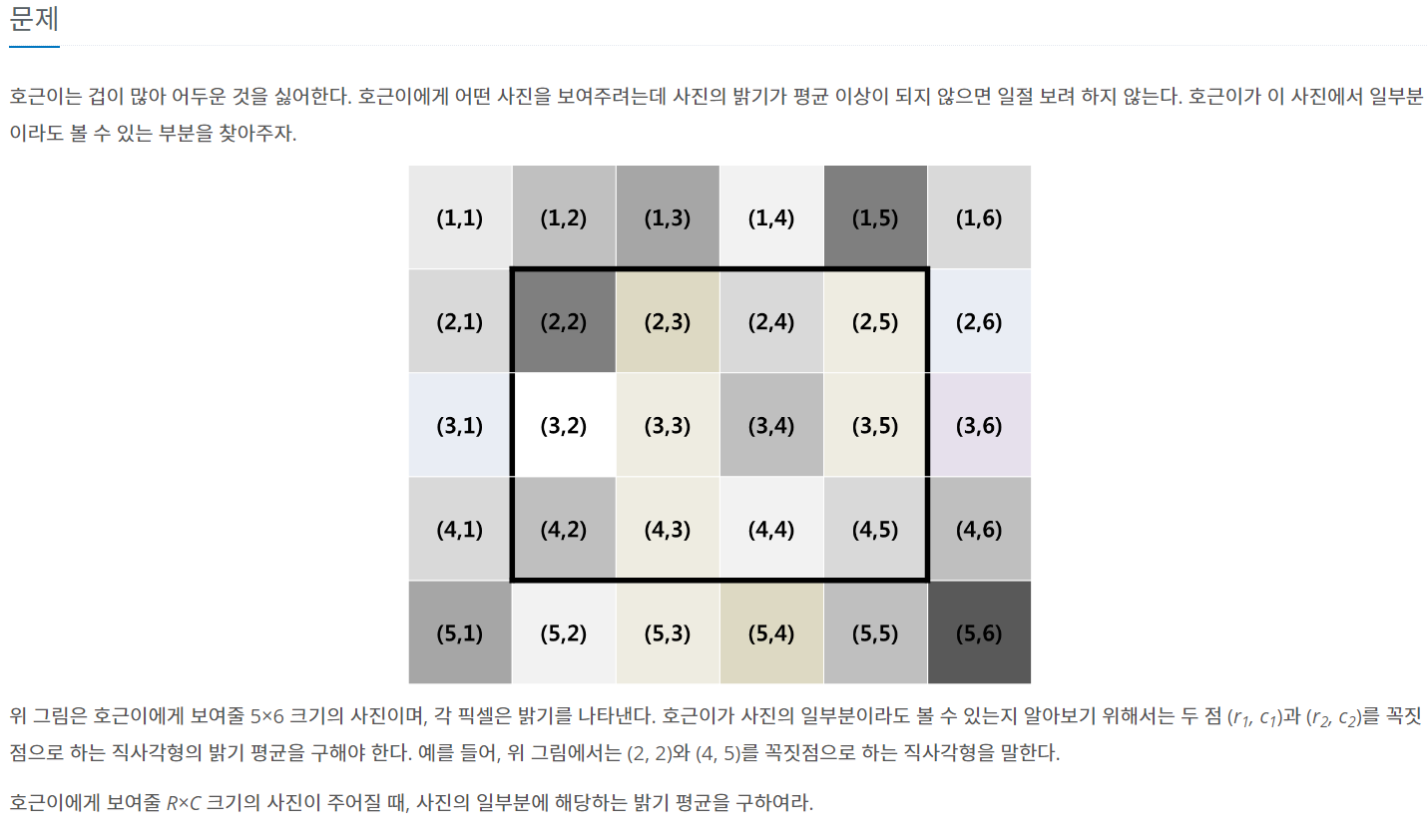 - R x C 크기의 사진이 주어질 때, 사진의 일부분에 해당하는 밝기 평균을 구한다.